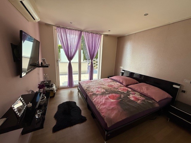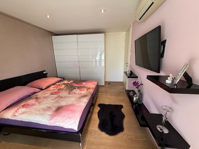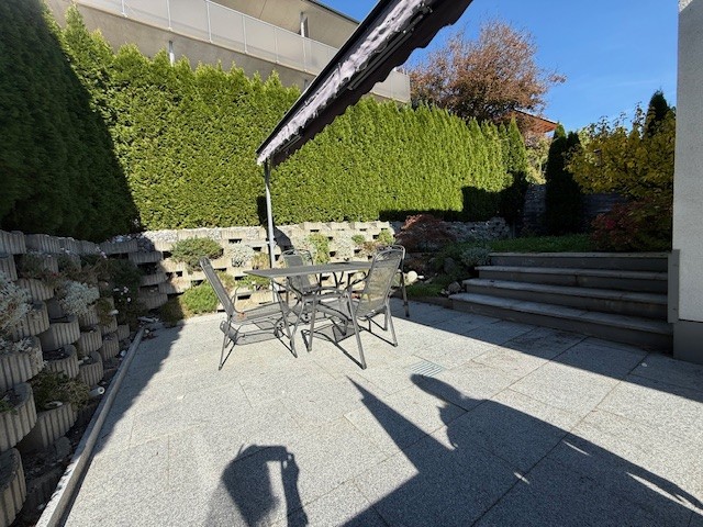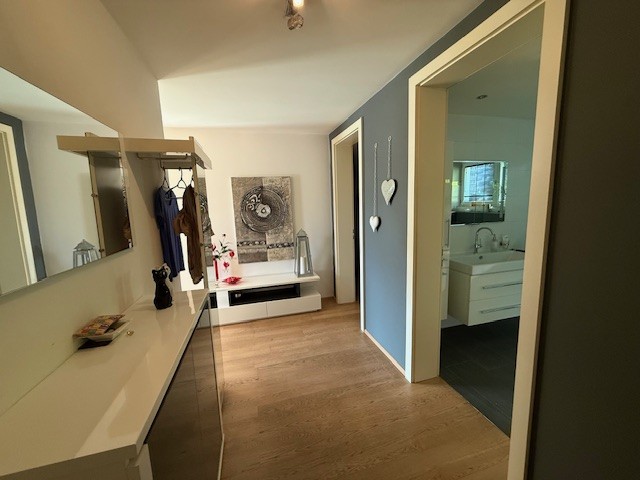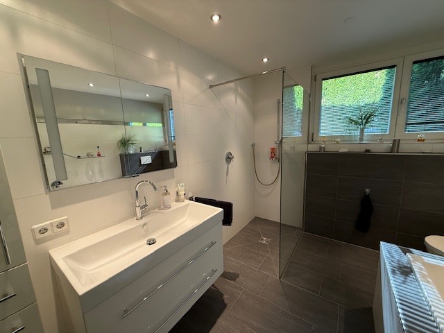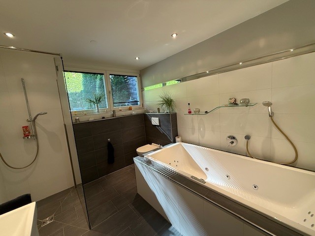 Das Schlafzimmer öffnet sich zur Westterrasse und in den privaten Gartenanteil – ein ruhiger Ort für entspannte Stunden oder den ersten Kaffee am Morgen. Das Badezimmer mit Fenster überzeugt durch klare Linien und Komfort: Whirlwanne, bodengleiche Dusche und geschmackvolle Möblierung schaffen einen modernen Spa-Charakter im eigenen Zuhause.