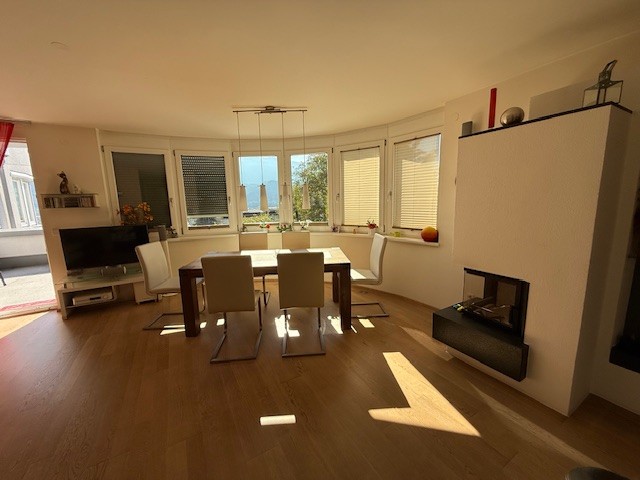 Der offene Wohnbereich ist das Zentrum der Wohnung – hell, großzügig und durch den Kamin mit Glasfront besonders einladend. Er schafft ein unvergleichliches Wohngefühl: modernes Design trifft auf gemütliche Wärme. Das sanfte Spiel der Flammen sorgt für Ruhe und Geborgenheit, besonders an kühleren Tagen. Von hier aus gelangt man auf die West- und Südterrasse, die mit herrlichem Blick über Innsbruck und die umliegenden Gipfel begeistert.